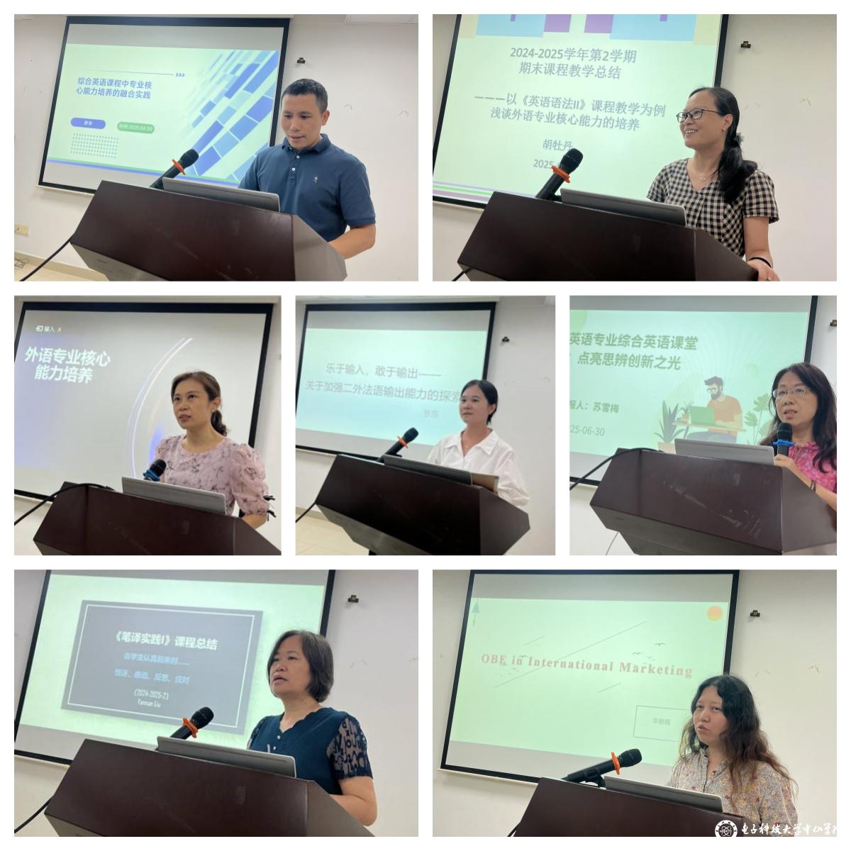 本次教学总结围绕三大主题展开:一是AI赋能教学,聚焦生成式人工智能在外语教学中的应用;二是守正创新,加强外语专业核心能力培养;三是基于OBE教学法的教学案例与反思。教师们结合本学期所授课程的教学实际,每人进行了十分钟的精彩汇报。