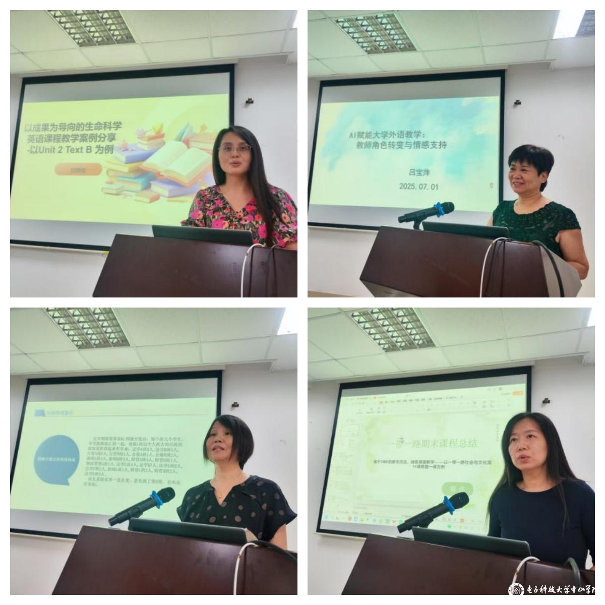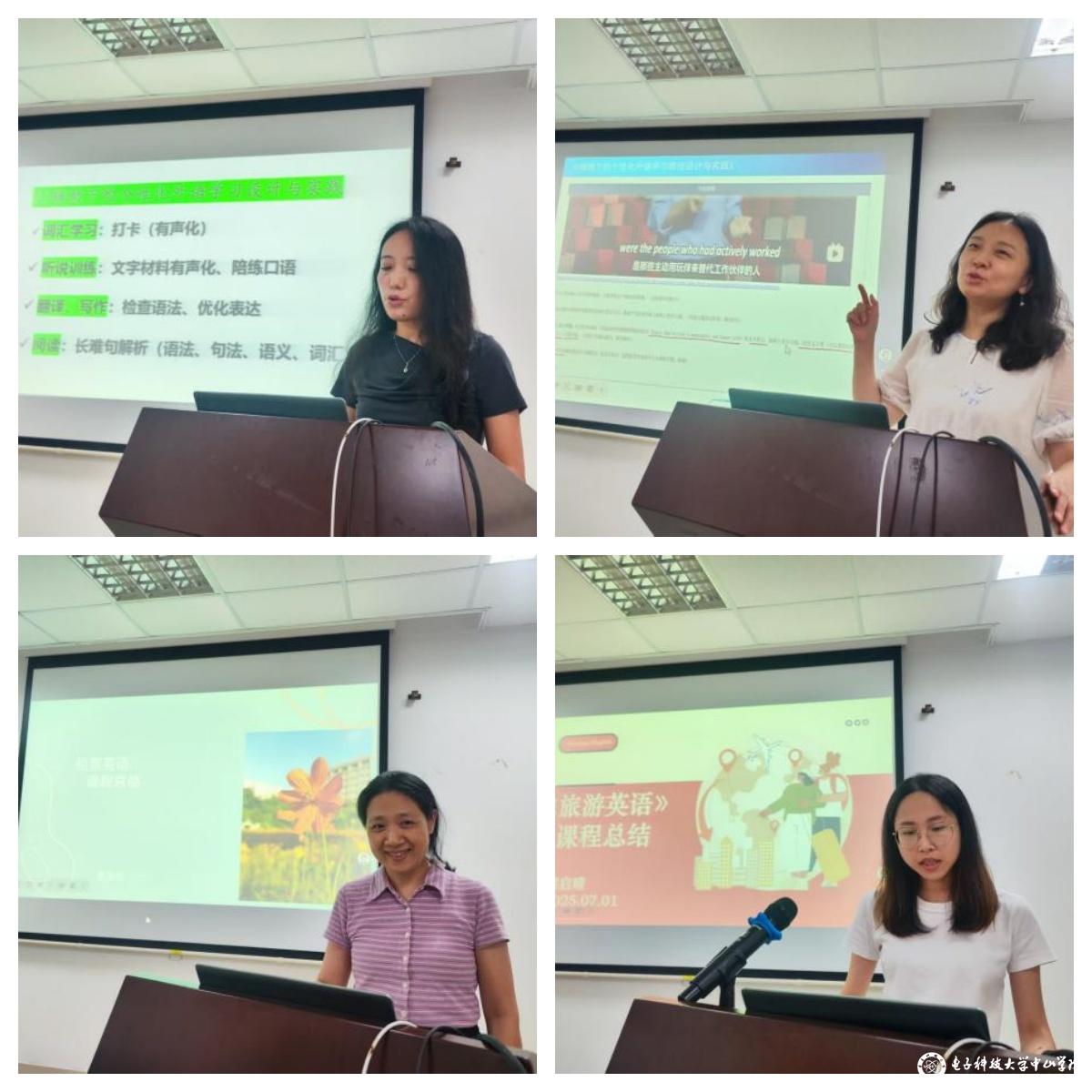 在数字化教育浪潮下,人工智能技术成为本次教学总结的核心关键词。左艳红老师率先展示AI辅助下的个性化外语学习设计与实践的成果,引导学生将AI与词汇学习、听说训练、翻译写作和阅读学习深度融合,显著提升了学生的学习积极性和效果。洪璇茉老师创新性地将生成式AI融入六级课程,学生使用AI工具完成微视频字幕生成、语法纠错等任务,强调技术工具不仅能提升学习效率,更是激发了学生的自主学习热情。
