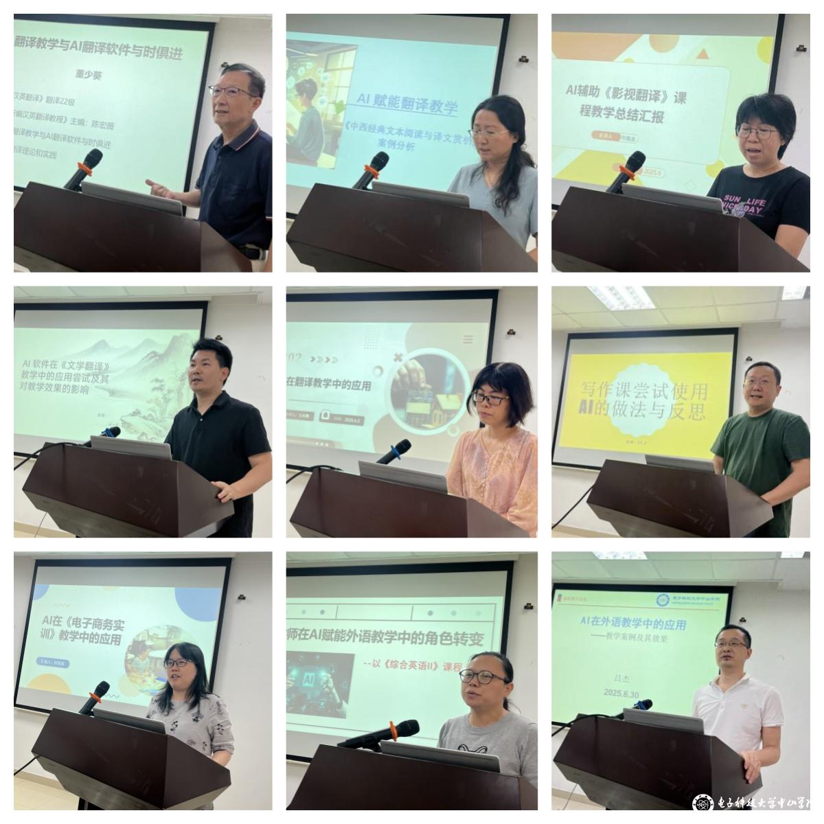 本次教学总结围绕三大主题展开:一是AI赋能教学,聚焦生成式人工智能在外语教学中的应用;二是守正创新,加强外语专业核心能力培养;三是基于OBE教学法的教学案例与反思。教师们结合本学期所授课程的教学实际,每人进行了十分钟的精彩汇报。