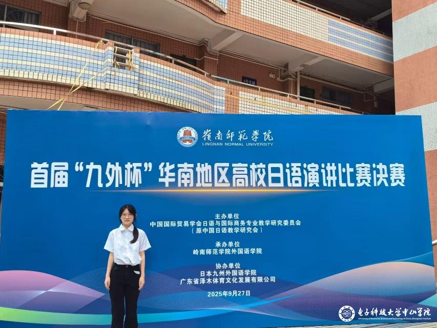 本次赛事面向华南地区(广东、广西、福建、海南)高校全日制本科生,分为网络初赛与现场决赛两个阶段。网络初赛采用命题演讲形式,选手从《AI技术的发展与我们的未来》《从“一次性文化”到“循环型社会”——青年的选择》《重识中国传统文化的当代价值》《失败赋予我的珍贵启示》四个题目中任选其一,进行3分钟脱稿演讲。经过激烈角逐,我院日语系2023级冯心妍同学凭借扎实的语言功底和精心的赛前准备,在众多参赛者中脱颖而出,成功晋级决赛。决赛于2025年9月27日在岭南师范学院举行。赛制为现场抽题即兴演讲,限时3分钟。面对来自各高校的优秀选手,冯心妍同学沉着应对、思路清晰,结合日常积累与系统训练,以自信从容的台风和流畅得体的表达,出色完成了演讲。