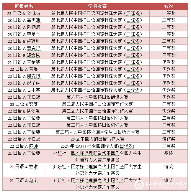 今年,日语系学生在第七届人民中国杯日语国际翻译(口笔译)大赛、第二届人民中国杯日语词汇大赛、第二届人民中国杯日语国际写作大赛、第二届人民中国杯全国大学生日语听力大赛、外研社•国才杯“理解当代中国”全国大学生外语能力大赛以及2024年CATTI杯全国翻译大赛(日译汉)等多项赛事中,凭借出色的表现,斩获了多项大奖。这些荣誉的取得,不仅是对学生们个人努力的肯定,更是对日语系教学质量和育人成果的充分展现。